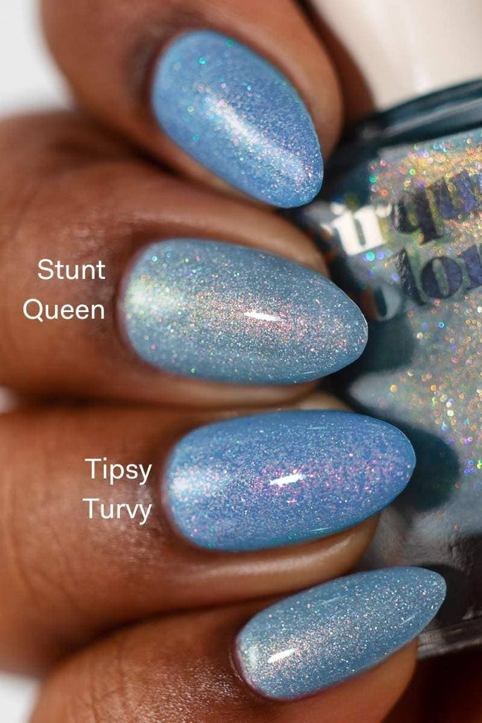 Stunt Queen is a light turquoise nail polish with orange-green-gold color-shifting shimmer and intense scattered holographic effect. Our Shimmergraphics™ combine glimmering shimmer pigments and prismatic holographic glitter which give off an intense sparkle effect.