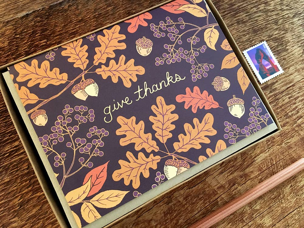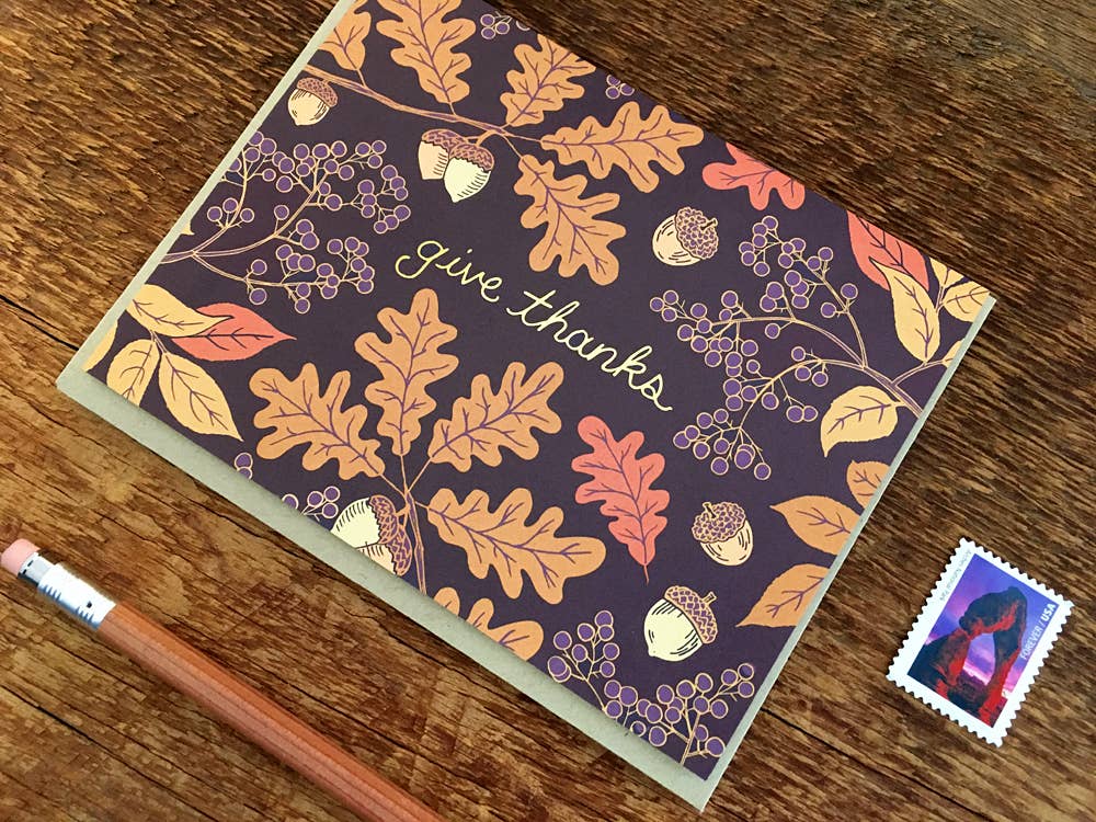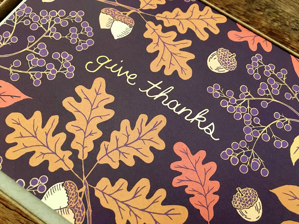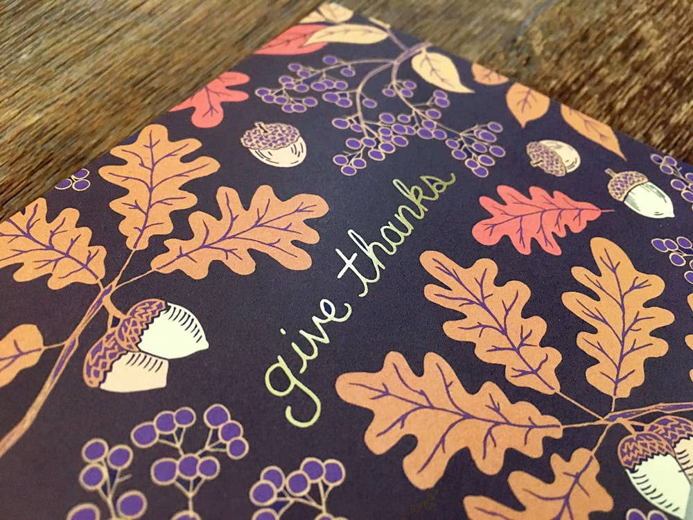 Image Description: a folded digitally printed deep plum card with various orange, red and purple flora across the entire front, the gold text "give thanks" centered