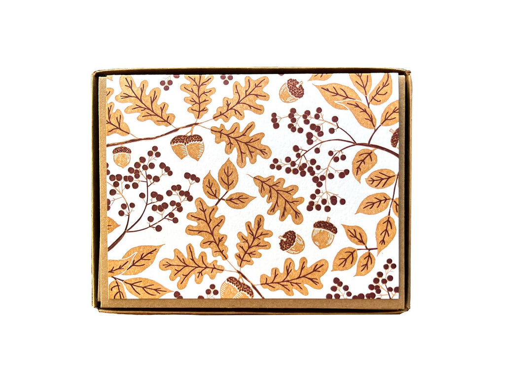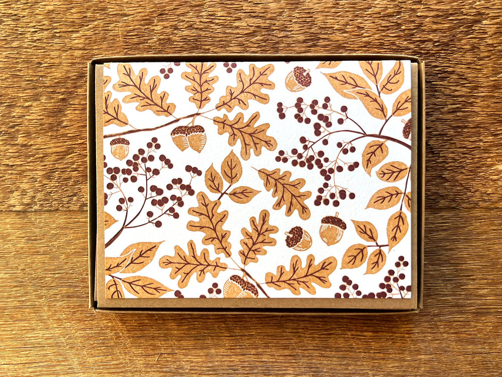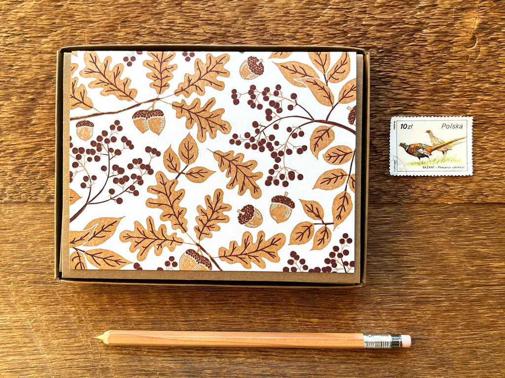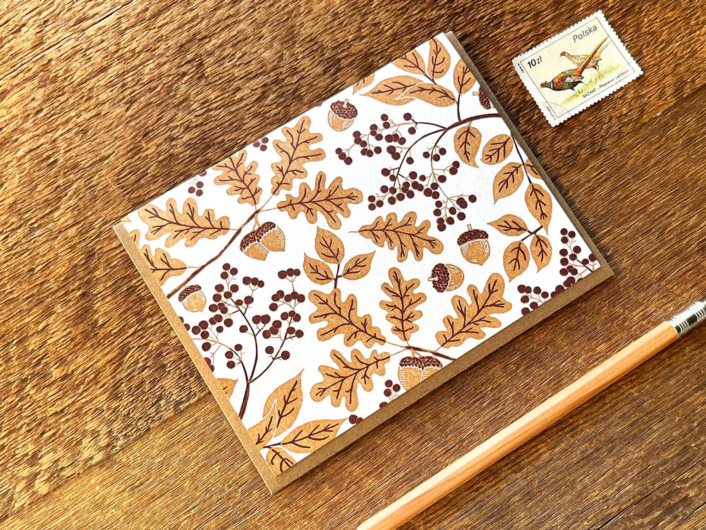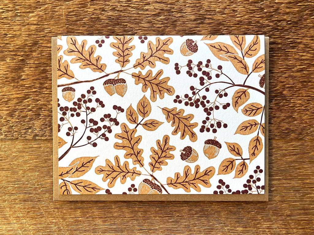 Image Description: a white folded A2 card with letter-pressed golden leaves, acorns and dark purple berries covering the front