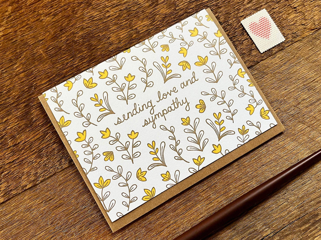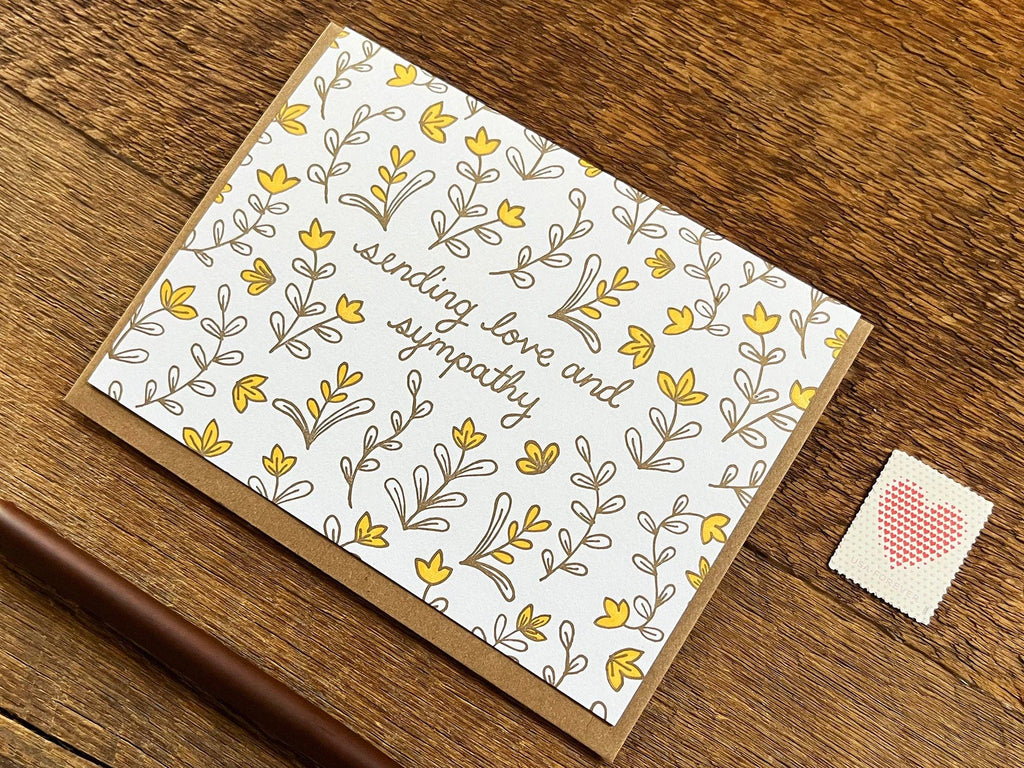 Image Description: a white folded A2 letterpress card, the light brown text "sending love and sympathy" in the center of the card, surrounding the text are yellow flowers with brown simple leaves