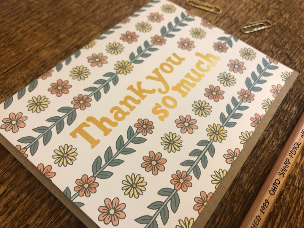 Image Description: an offset and foil printed folded cream card, flower and leaf banners go across the card, the gold text "thank you so much" centered on the card