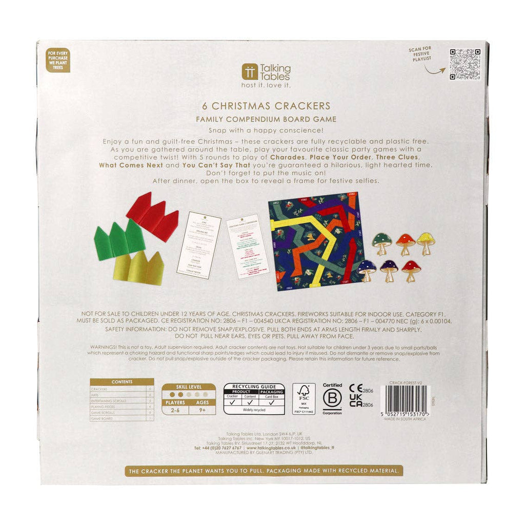 Back by popular demand, our bestselling Midnight Forest Christmas Crackers are now even better for this festive season. Featuring lush green tones, whimsical toadstools, and forest foliage, each cracker is handmade and includes a crown, joke, and brand-new compendium game created by our in-house team. The box transforms into a photo frame and includes a QR code linking to a festive playlist—offering entertainment even before the crackers are pulled. Made from FSC-certified paper, these crackers are 100% plastic-free and fully recyclable.
