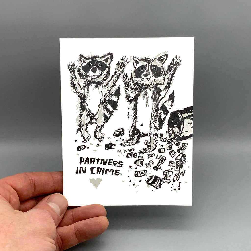 Partners In Crime / WL0172 A folded note card with kraft envelope. Letterpress printed on premium 100% cotton paper. Blank inside. Size: 4.25" x 5.5" (folded) Packaged in clear cello. Designed and letterpress printed in Portland, Oregon.