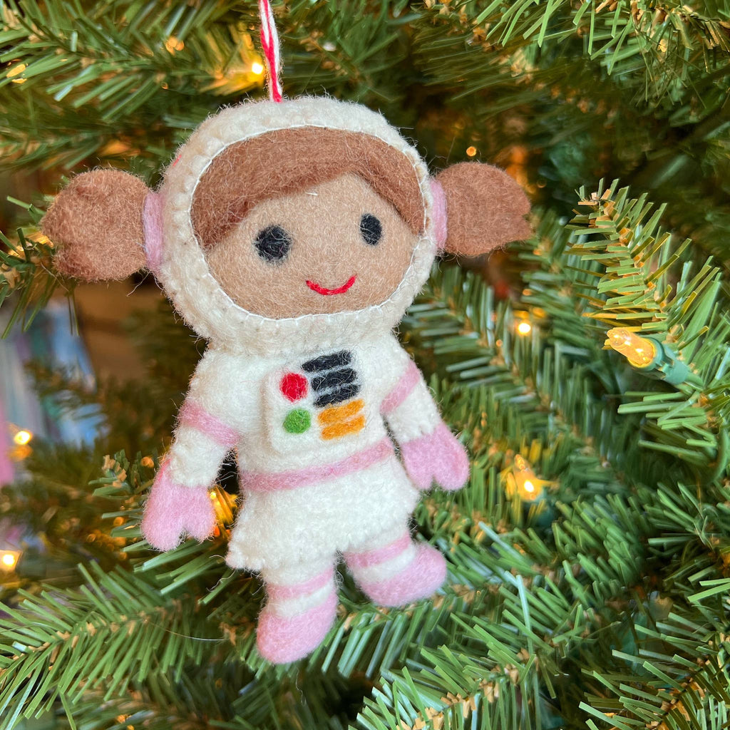 Your little explorer will love our Kid Astronaut Ornament! This cheerful child is suited up and ready to see the galaxy. Our Felt Christmas Ornaments are handmade by artisans in Nepal, Asia using colorful sheep wool. Popular for their charming designs, felt ornaments are soft, durable and excellent for holiday gifting. Perfect stocking stuffers for kids, gift toppers or whimsical Christmas decor! Chose from the Boy in Blue or Girl in Pink.