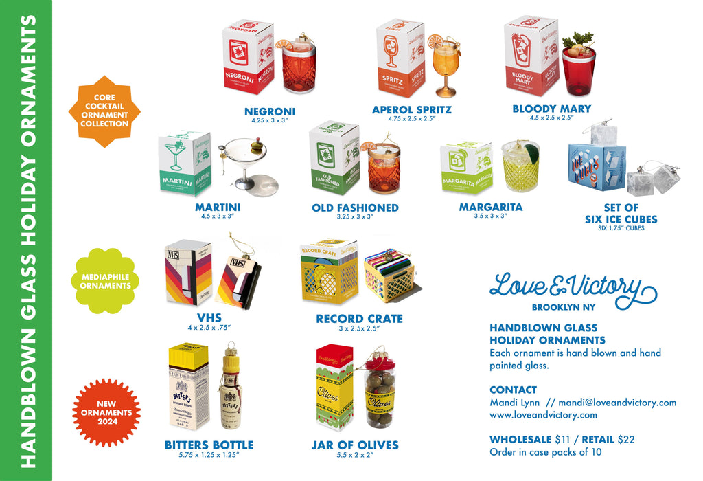Deck the halls with ice cold Martinis. ‘Tis the season to celebrate our evergreen love of frosty Martinis (shaken OR stirred), now in ornament form. Each hand-blown glass cocktail ornament features a classic stemmed martini glass, with hand-painted details like an olive garnish. The glittery silver hanging loop includes a round L&V charm for added holiday cheer.