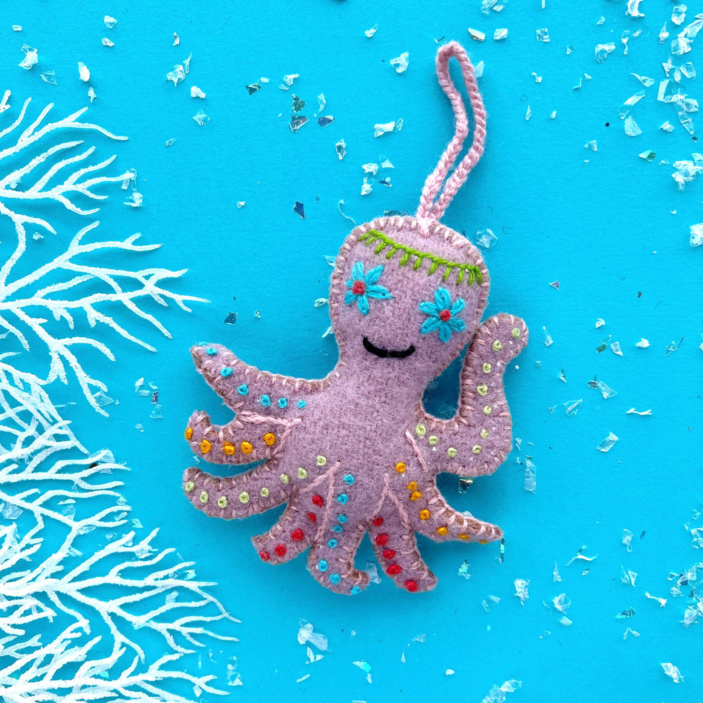 Take a whimsical journey under the sea with our ocean themed Christmas ornaments. This groovy Octopus Ornament is ready to make a splash this holiday! Handmade by artisans in Peru, South America using traditional craftsmanship, each soft pink octopus features detailed floral embroidery. Popular for their charming designs, wool ornaments are soft, durable and excellent for holiday gifting. Perfect stocking stuffers for kids, gift toppers or unique Christmas decor!