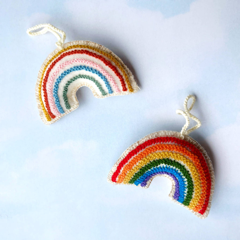 Make a wish on this sweet Rainbow Ornament. Our colorful wool rainbows are handmade by artisans in Peru, South America using traditional craftsmanship. Each ornament is hand stitched and embroidered with colorful yarn. Available in two motifs: traditional rainbow colors or muted pastels. Perfect for a Christmas tree or creatively displayed year round.