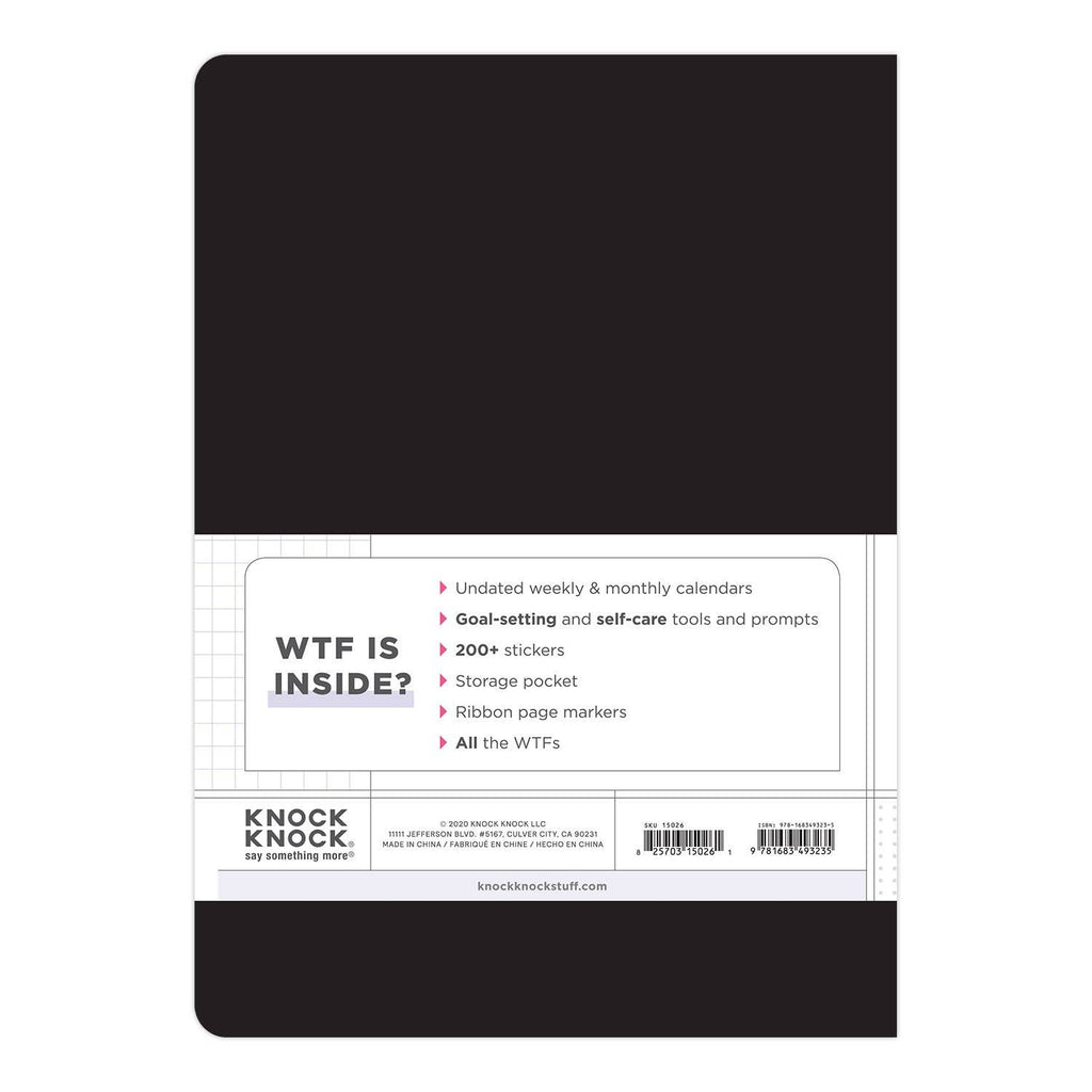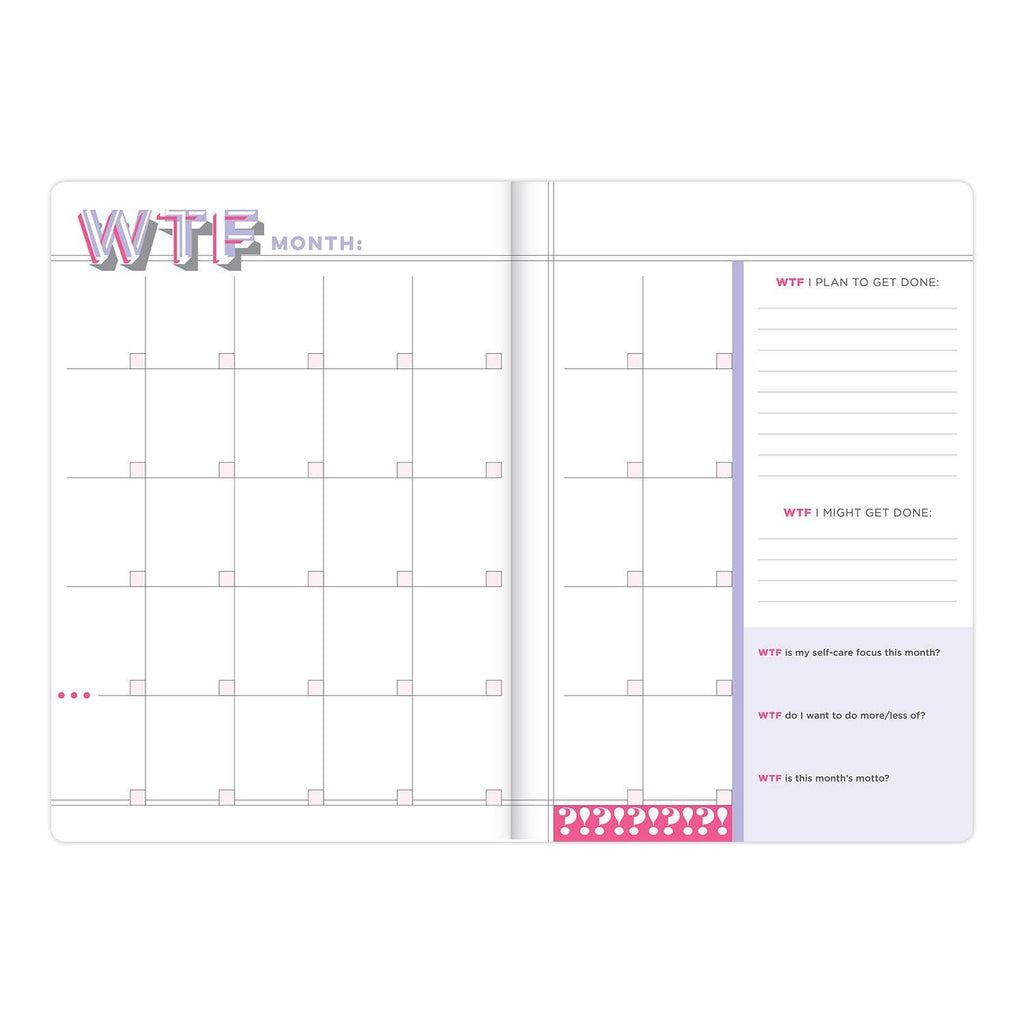 Figure out WTF you want (and need) to do! This planner without dates will help you set goals, take care of yourself, and get crap done—for a whole WTFin’ year. Inside its got: 12 undated monthly calendars + 60 undated weekly calendars + goal-setting prompts and self-care tools + over 200 stickers. Not to mention, like 500 WTFs. Bam!