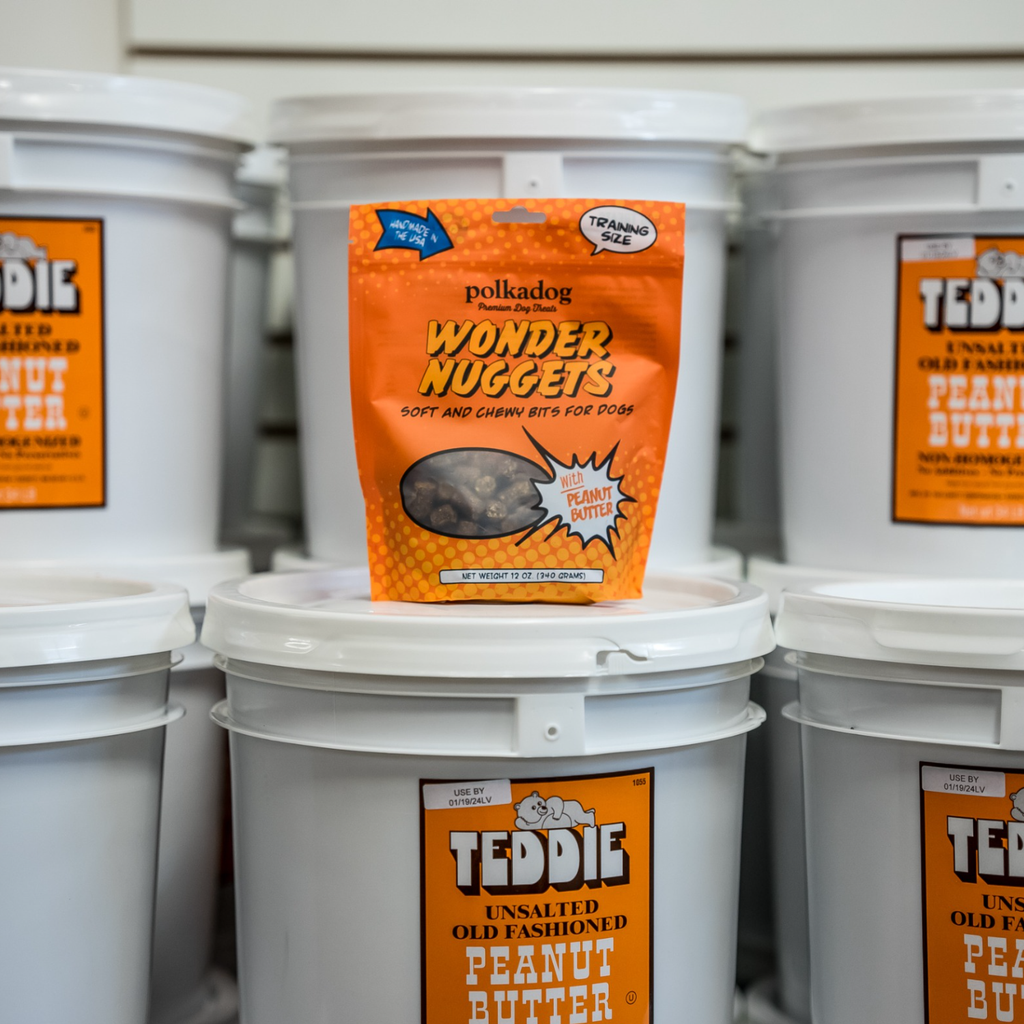 Formulated with all-natural peanut butter from none other than Teddie's Peanut Butter down the street in Everett, MA, these Polkadog peanut butter dog treats are soft, easy on the stomach, and ideally show-sized-for-training rewards or quick treats on the go.