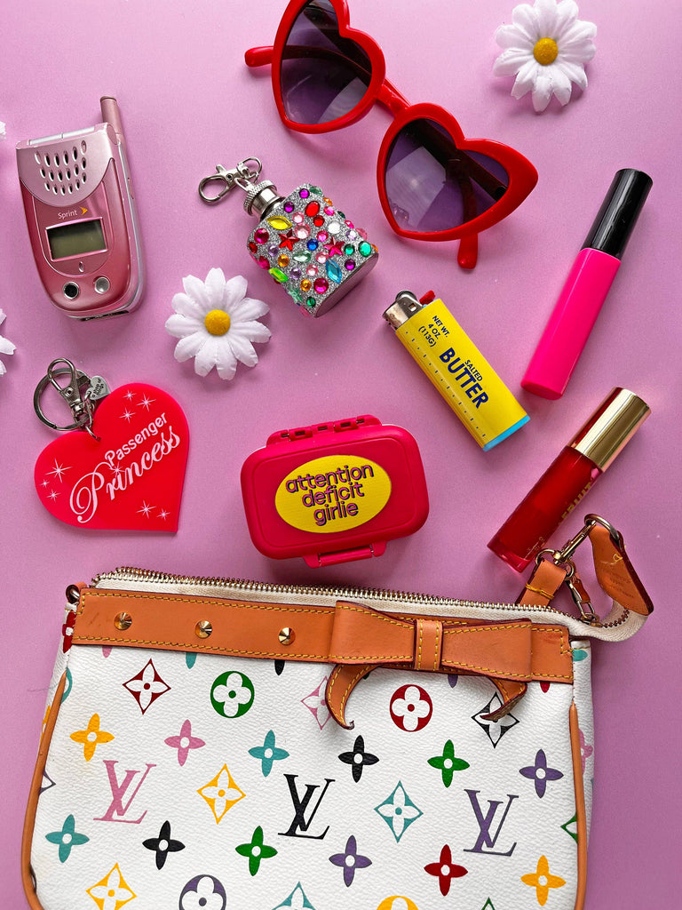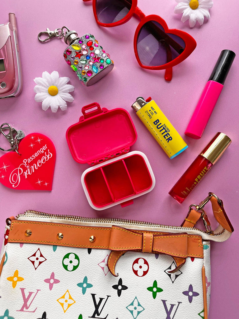 Carry your meds and vitamins in style with this pink pill case that has two convenient, removable dividers on the inside that creates 3 separate compartments . Shaped like an adorable mini suitcase. Water proof + smell proof!