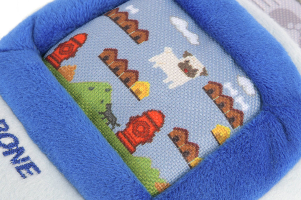 Level up playtime for your furry gamer with P.L.A.Y.’s 90s Classics Game Bone toy! This Gameboy-inspired toy boasts a detachable video game named “Super Momo & Pals” with a box squeaker inside for double the fun. The game bone itself features a squeaker in the body for thrilling play and crinkle fabric on the sides for an extra touch of texture. Watch your pup embark on a canine quest with Momo and her pals in every play session! Hand-made craftsmanship, double layer exterior and reinforced stitching for extra durability Eco-friendly PlanetFill® filler is made from 100% post-consumer certified-safe recycled plastic bottles Machine washable and dryer friendly Features AZO-free dyes All of our toys meet the same strict quality standards for manufacturing infant and children products. Meet requirements for EN71 – Part 1, 2, 3 & 9 (EU), ASTM F963 (US) toy safety standards and REACH - SVHC